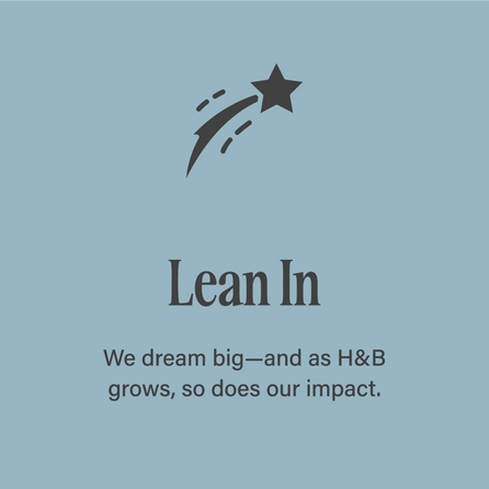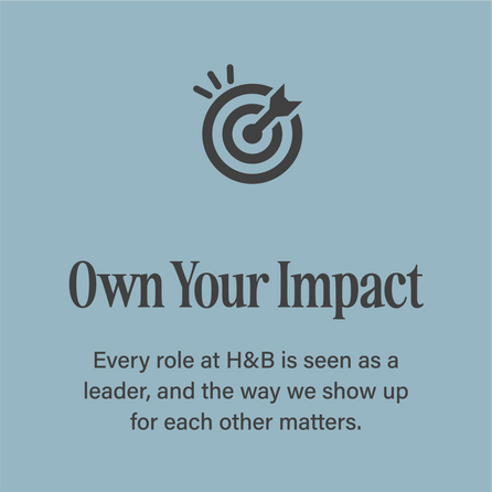 In addition to health benefits, bereavement, mental health and sick time, H&B offers a health spending account, as well as an employee family assistance program. Our intent is to encourage employee flexibility and we support employees to strengthen their wellness practice at home and at work.